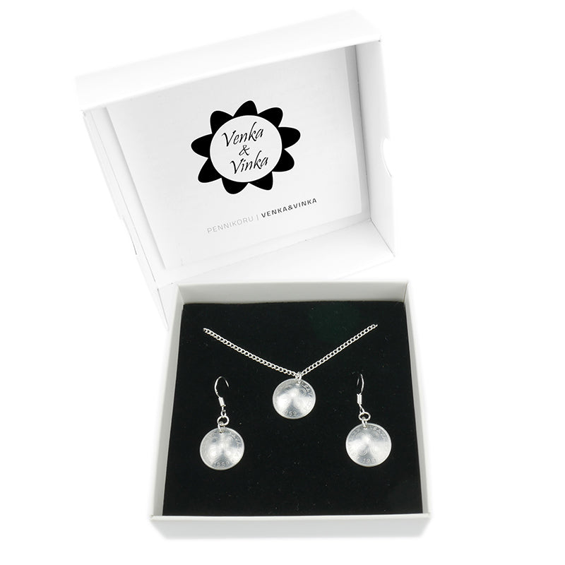 Pennikorusetit sisältävät markka-ajan penneistä valmistetut korvakorut ja kaulakorun.